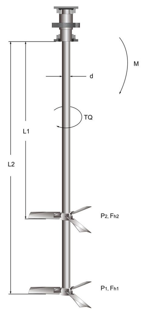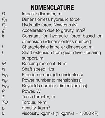 An agitator assembly must withstand a variety of loads. Figure 2 illustrates these loads, excluding thrust loads, which are not within the scope of this article. The main loads affecting shaft design are the torque (TQ) and the bending moment (M). The torque is calculated using Equation (1).