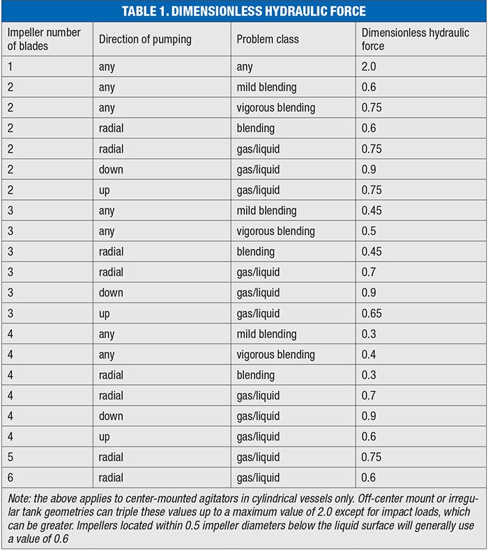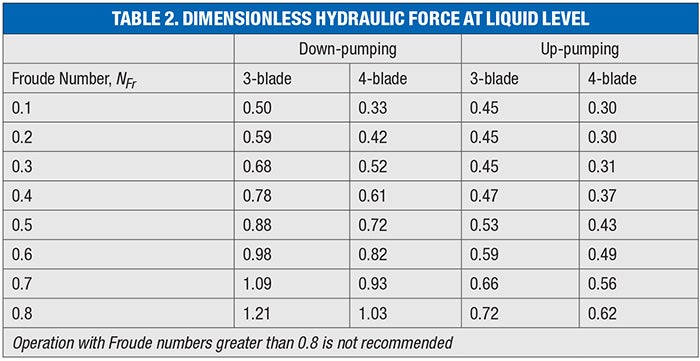 Full-scale data on large equipment (witnessed by the author) have demonstrated that the hydraulic force operating at liquid level is much higher when the agitator is down-pumping compared to up-pumping. Table 2 lists the dimensionless hydraulic force values the author recommends as a function of Froude number, pumping direction and number of blades for axial or pitched-blade turbines. Values for radial-flow impellers are unknown to the author, but are expected to be between the up- and down-pumping direction values. Designers should use whichever value is greater between Tables 1 and 2.