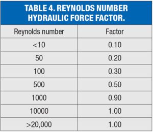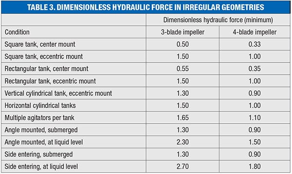 So far, all we have discussed has been for center-mounted agitators centered in cylindrical tanks. But there are cases where the mounting is less symmetrical. This can include off-center mounting, angle mounting, square or rectangular tanks, horizontal cylindrical tanks, multiple agitators per tank and possibly many others situations. Table 3 is the author’s guide to the minimum hydraulic factor that should be used. If other conditions are present, use the greatest value from Tables 1, 2 and 3.