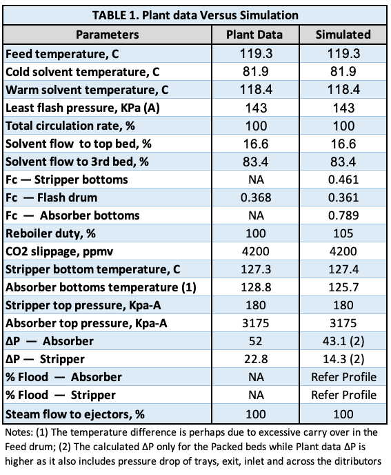 The engineering team developed a detailed simulation model of the Benfield CO₂ removal system using a rigorous, rate-based framework. Actual plant operating data, including flowrates, temperatures, pressures, CO₂ loading, solvent composition and utility usage, were integrated with original design documentation and field-verified equipment configurations. Special care was taken to accurately represent the installed column internals, including specific packing types and hydraulic capacities in both the absorber and stripper.