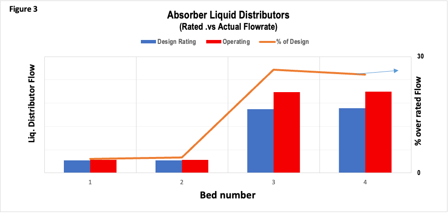 Liquid distributors — The liquid distributors in the lower two beds were under-rated and likely overflowing, reducing efficiency. Upper distributors, while near design capacity, had low drip density and poor liquid distribution. Figure 3 shows that the lower distributors are operating at more than 125% of their rated capacity; the upper distributors are nearing their maximum limits.