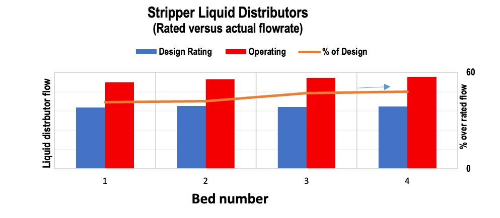 Liquid distributors — All four distributors operated above 140% of their rated capacity (Figure 5), resulting in poor liquid distribution and degraded performance.