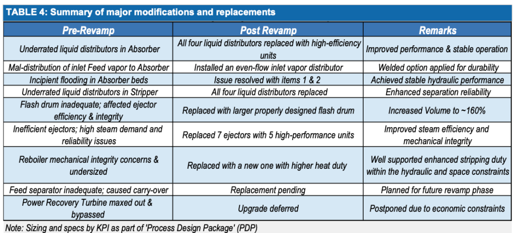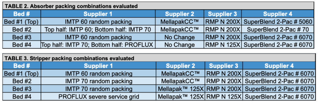 - Replaced random packing in the absorber with high-capacity metal tower packing to reduce flooding risk