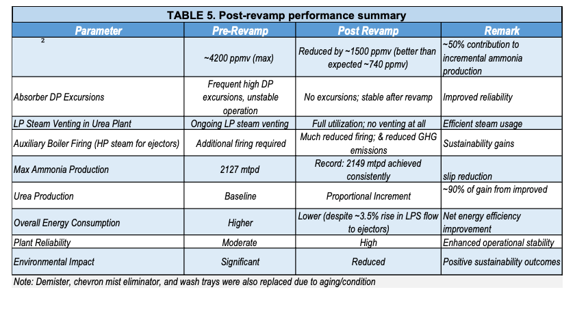 - Impact: Improved CO₂ stripping capacity, reduced LP steam consumption, and enhanced thermal stability, contributing to lower emissions and improved ammonia synthesis loop efficiency.