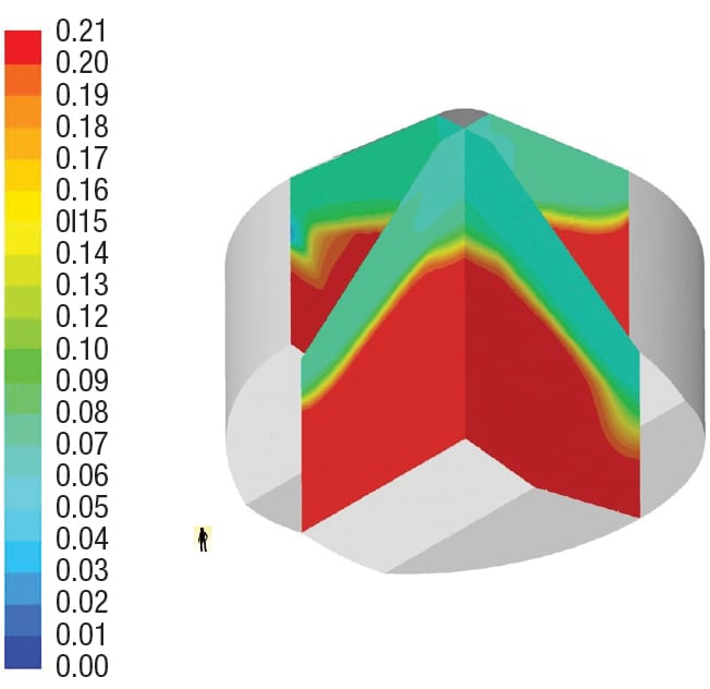 The authors were involved with a recently designed and installed nitrogen-inerting system in a large biomass hopper with the aid of computation fluid dynamic (CFD) modeling. The CFD models provided precise estimates of the methane offgas concentration levels throughout the silo and guided the placement and orientation of nitrogen-injection nozzles throughout the silo (Figure 5). Rather than flood the silo with nitrogen, the hopper owner was able to apply nitrogen in locations and amounts that exactly matched what was required to prevent a dust explosion within a large space.