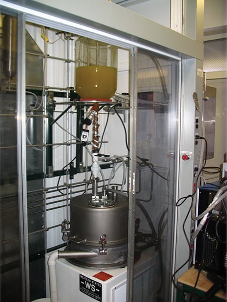Melt crystallization is a less common and more specialized technique that is capable of producing extremely high product purity, and it can be useful when a liquid product is acceptable. When melt crystallization is possible, it offers the benefit that solids handling operations can be avoided, and the associated separation and drying equipment is not necessary. One limitation is that the product must be able to be handled at its melting point. If a material is either unstable at its melting point or its melting point temperature is very high or very low, such that processing at that temperature is impractical, melt crystallization is not a possible solution. An example of a laboratory melt crystallizer is presented in Figure 5.