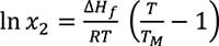 Where x2 is the solubility mass fraction, ∆Hf is the crystal heat of formation, R is the gas constant, T is saturation temperature, and TM is the melting point temperature.