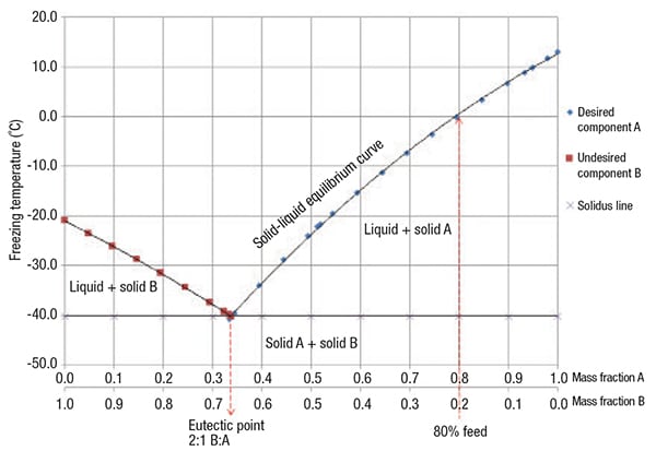 For the example above, wherein the feed contains 80% of the desired product, component A, and 20% of the undesired component B, a maximum of ~87% yield can be obtained. To reach this maximum, cooling to –40˚C is necessary. However, if cooling were completed in only one step, the slurry density would be exceedingly high. At greater than 60% TSS, it is unlikely that this slurry could be processed. Thus, splitting the process into multiple steps is probably required.