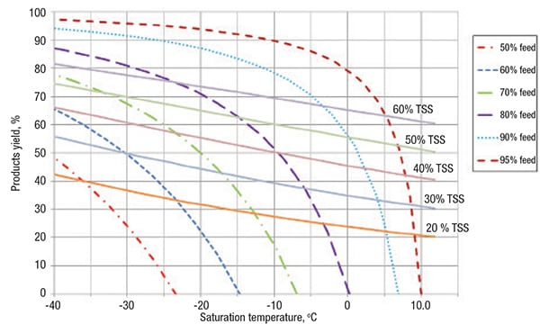 This has proven to be a valuable tool for quickly estimating the yield that can be obtained with a given feed concentration and operating temperature. The value for TSS is also included for consideration, since there is a practical upper limit that should be observed in order to end up with a slurry stream that is manageable and can be pumped and transferred without plugging. The operating TSS is usually the highest TSS with which the equipment can comfortably operate. This level often ranges from 30 to 40% TSS.