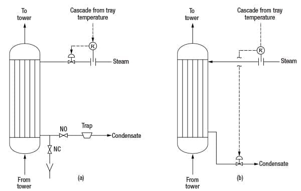 Methods for controlling reboilers in distillation towers are central to good reboiler operation and tower stability. Control valves can be located in the steam-inlet line or in the condensate-outlet line. This article updates guidance for key considerations and practices using both schemes