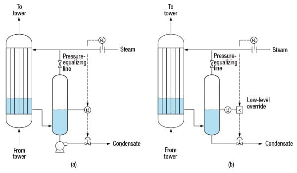 There are several ways of preventing this seal loss. The scheme in Figure 2a, but without the pump, is one option. Alternatively, the setup in Figure 2b can be used. Here, the flow controller normally regulates the condensate valve, with the level override cutting in whenever the level falls too low. The level override should not be set at a vertical height much greater than the bottom of the reboiler. Otherwise, some of the tubes will always be submerged and the effective reboiler capacity will be reduced. Often, especially in vertical reboilers, the liquid level in the condensing side of the reboiler can be monitored and used for level override control, so the drum can be omitted.