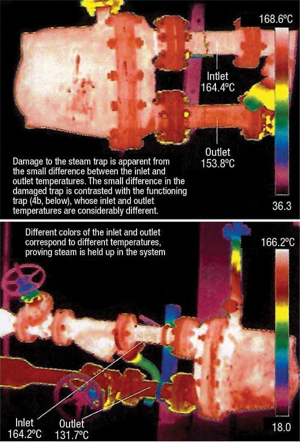 Figure 4. The images show thermal scans of steam traps. In 4a, the trap is passing steam, so a small difference between inlet and outlet temperatures is observed. In 4b, the properly functioning steam trap shows its condensate is significantly cooler than the steam (from Ref. 31, reprinted with permission, courtesy of AIChE)