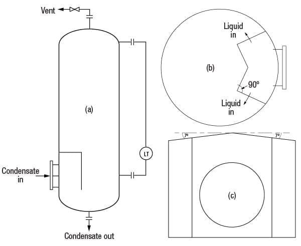 Figure 8. These diagrams show a condensate pot with a channel baffle directing the subcooled condensate away from the pot liquid surface. In 8a, it is at elevation; 8b shows the view from the top of the channel baffle; and 8c depicts the view from the inlet nozzle