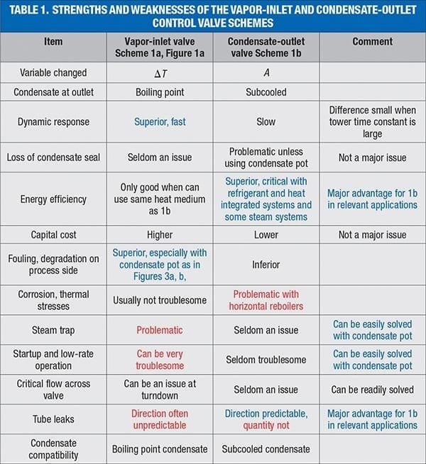 Table 1 provides a summary of the strengths and weaknesses of the two schemes. In the table, blue print represents major strengths, while red points out major weaknesses.Scheme 1a has major advantages of fast dynamic response and handling fouling and thermally degradable systems. The advantage in thermally degradable and fouling systems can be enhanced with judicious condensate-pot and pumped-condensate design. Its drawbacks are the steam trap and the ability of getting rid of the condensate at turned-down operation, but both can be overcome with a good condensate-pot design.