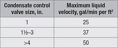 - The maximum recommended liquid velocity through a vertical drum is generally a function of the condensate valve size, as shown below: