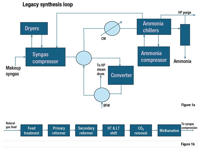 The transition of the ammonia synthesis loop from conventional methane-based syngas — typically containing substantial levels of inert components, such as argon and methane — to a stoichiometric blend of high-purity hydrogen and nitrogen introduces a suite of complex process and engineering challenges. The virtual elimination of inert materials has a significant impact on both the catalyst bed’s thermodynamic equilibrium and kinetics, as well as the overall hydraulic assessment of the synthesis loop. Change in the circulation rate impacts heat-exchanger duties, system pressure drops and the turndown capability of syngas compressors.