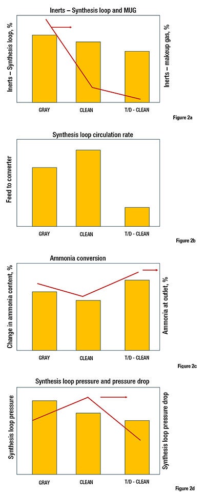 The engineering team undertook a comprehensive re-rating of the entire synthesis loop across all projected operating scenarios, including a detailed kinetics assessment of the converter beds. This resulted in the optimization of critical operating parameters, including inert concentration, pressure, circulation rate, bed-temperature profiles, pressure-drop behavior, heat-exchanger loads and compressor performance (for both syngas and ammonia services). Catalyst-bed profiles were further validated through collaboration with all major catalyst suppliers to ensure the desired temperature profiles and ammonia production rates were achievable.