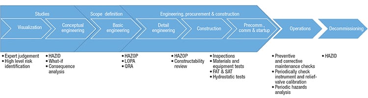 In each of the plant life phases, different choices are made by engineers that have a direct impact on the overall risks in the facility; however, the highest opportunities for cost-effective risk reduction are present in the earlier phases of the project. In contrast, the cost of implementing changes in the later stages of the project increases dramatically. Hence, it is important for the design team to identify risks, and implement effective design solutions as early as possible.
