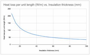 Figure 2. The graph shows heat loss per meter versus insulation thickness for 4-in. pipe, showing diminishing returns beyond 70 mm