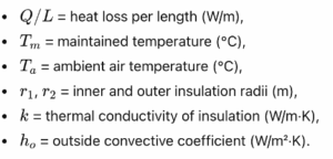 This is the core expression in IEEE Std 515, the reference standard for electrical heat tracing in the chemical industry. It’s simple enough to fit on a napkin but accurate enough to size tracing loads or justify insulation upgrades.