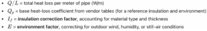Rule-of-thumb (datasheet) approach. Most engineers first meet heat-loss estimation through vendor tables — like the Chromalox Design Guide. Engineers can select a pipe size, insulation thickness and surface-temperature difference (ΔT), then read a corresponding correction factor (for insulation type) and environment factor (outdoor or indoor):