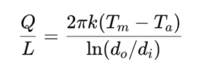For a cylindrical surface such as a pipe, the total heat flow per unit length can be expressed by Fourier’s law combined with an external film coefficient: