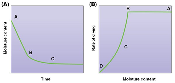 Constant-rate zone. In a typical graph of moisture content versus drying rate and moisture content versus time (Figure 1 [2]), section AB represents the constant-rate period. In that zone, moisture is considered to be evaporating from a saturated surface at a rate governed by diffusion from the surface through the stationary air film that is in contact with it [2].