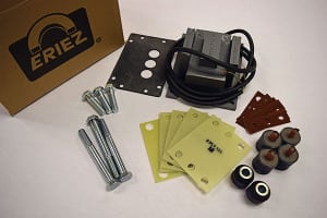 This company now offers spare- parts kits for its light- and medium-duty vibratory feeders (which have totally enclosed, patented magnetic drives). These spare-parts kits (photo) contain the parts needed to rebuild most the company’s Model A, C and High Speed (HS) and High Deflection (HD) vibratory feeders. A typical kit includes a corded electrical assembly, diaphragm, shock mounts, elastomers (several versions), tuning springs (front and back), spacers and associated hardware. — Eriez, Erie, Pa.