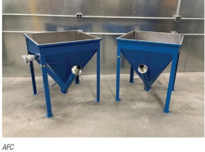 This company offers custom hoppers that automatically start feeding when loaded and automatically shut off when empty (photo). Featuring designed-in high-level rotary switches, the steel hoppers begin discharging when material tops a preset level and sound an alarm when material needs to be added to prevent the system from running dry. Material flows from hopper discharge to conveyor infeed without interruption while safeguarding the conveying system from the risk of excessive heat buildup and wear. The custom hoppers also include fittings for air diffusers to permit future flexibility in transferring non-free-flowing materials such as starches, salts and animal feed supplements. The hoppers can be fitted with vibrators, dust-control covers, stainless-steel construction, sanitary finish and other options in varying dimensions to suit nearly any material properties and throughput targets. — Automated Flexible Conveyor, Clifton, NJ.