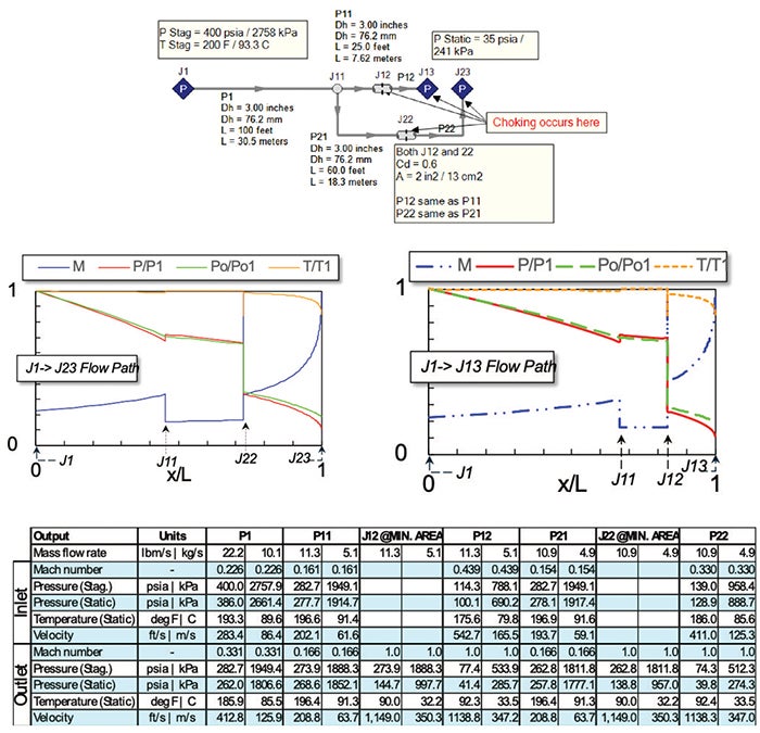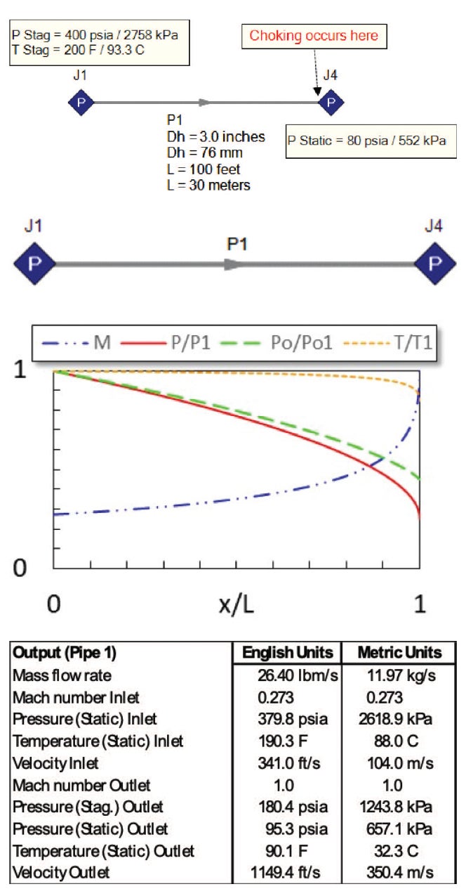 Example 1: Endpoint choking, single choking point. Figure 3 (top) shows the input for Example 1, endpoint choking, and Figure 3 (bottom) shows the output. Here, the Figure 2a boundary condition combination is used. From Figure 3 (bottom), any discharge pressure at or below 95.3 psia (657.1 kPa) will result in choking.