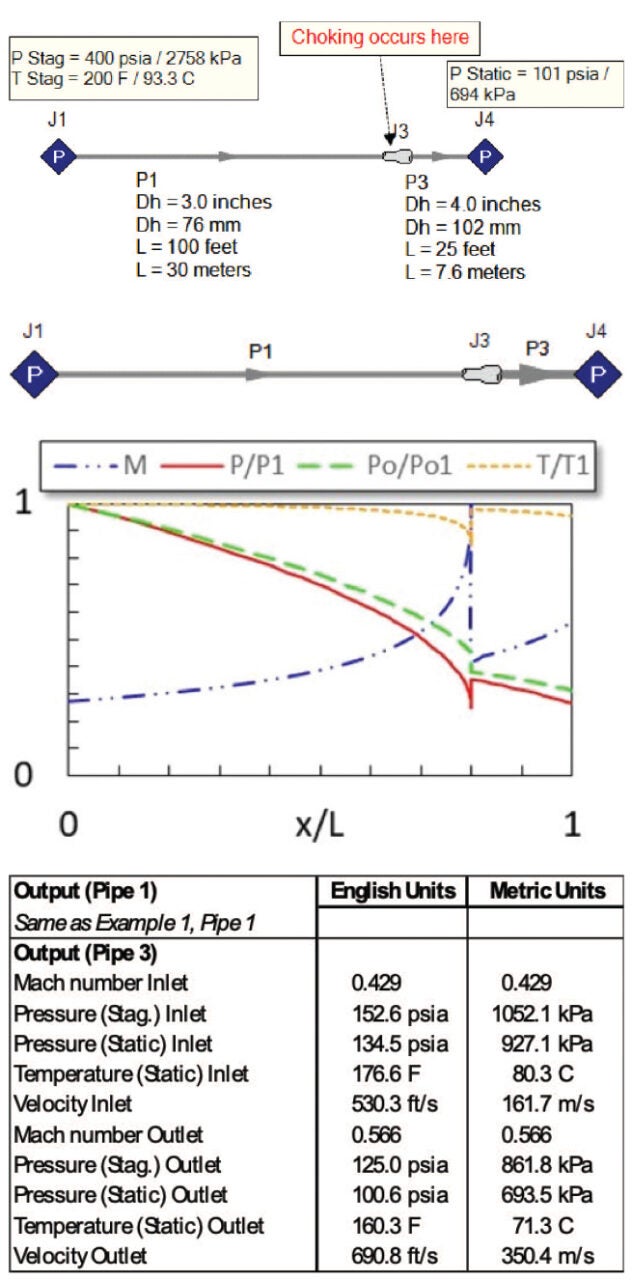 Example 5: Two choking points in series with restriction choking first. Example 5 is the same as Example 3 (with Figure 5, top), except with one change. The downstream pressure is reduced from 100.6 psia (693.5 kPa) to 50 psia (344.7 kPa). Figure 7 (top) shows the input. This results in endpoint choking occurring at J4. Hence, there are two sonic choking points. Figure 7 (bottom) shows the output. Similar to Example 3, the Figure 2a boundary condition combination is used for Pipe 1 and the Figure 2c boundary condition combination is used for Pipe 2. Mass and energy conservation across J2 determine the conditions at the inlet of Pipe 2, similar to Pipe 3 in Example 3.