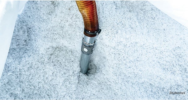 A good example of this can be found within PVC production. To closely monitor inventory, INEOS Inovyn wanted to continuously measure the level of PVC powder in a 23-meter-high silo at its plant in Stenungsund, Sweden (Figure 2). As with all solids level measurement, the varying surface reflection made this a challenging application, but this was amplified by the fact that PVC has a small particle size. Dust generated during filling was a major issue. Non-contacting radar had been used to provide the measurement, but buildup was impacting the reliability of the measurement. Regular maintenance (cleaning) was therefore required, which interrupted the production process at often inopportune times. A non-contacting radar level transmitter with a process seal antenna was utilized, with air purging that prevented buildup on the antenna. The transmitter has an algorithm for solids, which has enabled a stable reading, and the new solution has significantly reduced maintenance interruptions.