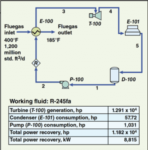The economics and heat-recovery potential of an ORC are a function of the thermodynamic properties of the selected refrigerant. Thus, the selection of the best working fluid for a given application is important to the successful implementation of any waste-heat-recovery system. Refrigerant blends may also be considered, and the choice of refrigerant or refrigerant blend must be optimized on a case-by-case basis. Designers and marketers of ORC systems and their component machinery have process simulations and empirical data that are needed to accurately model and optimize ORC systems specific to any given fluegas stream.