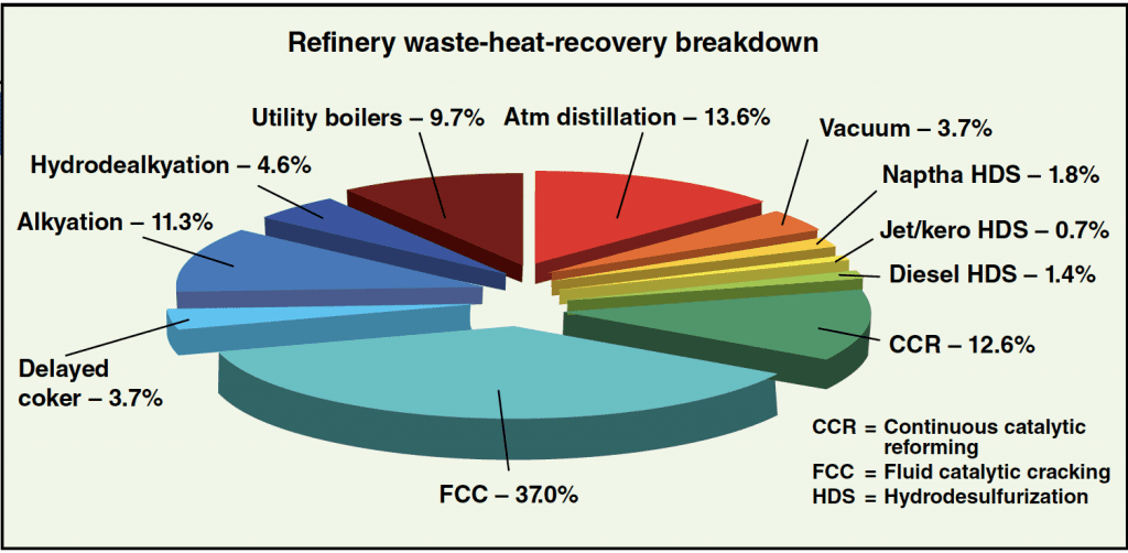 Figure 4. In this breakdown of heat recovery by refinery unit, one can see that particularly high rates of potential waste-heat recovery are possible for fluid catalytic cracking, atmospheric distillation and catalytic reforming units, as well as utility boilers