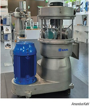 Pressing is a crucial step in any pelletizing plant because pressing can significantly increase bulk density. Compared to the starting material, the compactness of the pellets favors lower transport costs in conjunction with increased storage capacities. In addition, the conversion reduces heavy dust generation, especially in the case of small-structured pellets. The standardization of the material size represents another advantage — the pellets produced all have a predetermined size, so that the conveying systems can be operated reliably. This company offers variable machines and press types that cover different throughput capacities and are individually equipped for different bulk solids and materials. For example, the small press (photo) is particularly suitable for small pellet production from powdery and lumpy products. It offers low-effort installation. Furthermore, the 14-175 press model enables dry granulation before subsequent pressing of the tablet mass. Pellet presses and mills can be specified with GMP certification for use in pharmaceutical applications. Hall 10, Stand B51 — Amandus Kahl GmbH & Co. KG, Reinbek, Germany