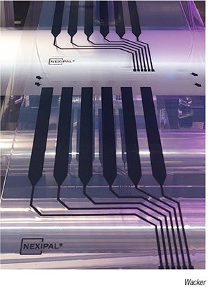 Nexipal Sense laminates (photo) consist of highly stretchable insulating and electrically conductive silicone rubber films. The laminate, a stack of film layers, jointly works as a flexible and stretchable capacitor. Pressure or flex movements change the electrical capacitance of the component. Different capacity states thus provide precise sensor signals for applications in medical technology, robotics and sports, and sets new standards for the development and application of flexible electronics. The silicone laminates typically consist of layers each with a film thickness of between 20 to 200 microns. The addition-curing silicone rubber laminates are characterized by their exceptional elasticity, dimensional stability and toughness. They are skin-friendly, biocompatible, UV-resistant and can withstand temperatures from –40 to 180°C. Even after millions of load cycles, they retain their high degree of recovery and elasticity, providing a major advantage over conventional materials. The structured layers — consisting of specially developed electrically conductive silicones — are composed using digital laser-printing techniques. With a resulting pixel size of just 100 microns, very fine electrode geometries are possible. Hall 6, Stand A10 — Wacker Chemie AG, Munich, Germany