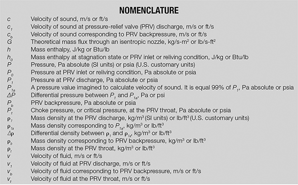 Fluid velocity calculation. When dealing with pressure-relief flows, it is often convenient to work with properties evaluated at a reference state known as the “stagnation state.” The stagnation state is the state that a flowing fluid would attain if it were decelerated to zero velocity isentropically. Figure 2 illustrates how an actual PRV can be conceptualized into a nozzle model. Compared to the high fluid velocity at the pressure-relief valve throat, the fluid velocity at the relieving condition (PRV inlet) is negligible. Thus,