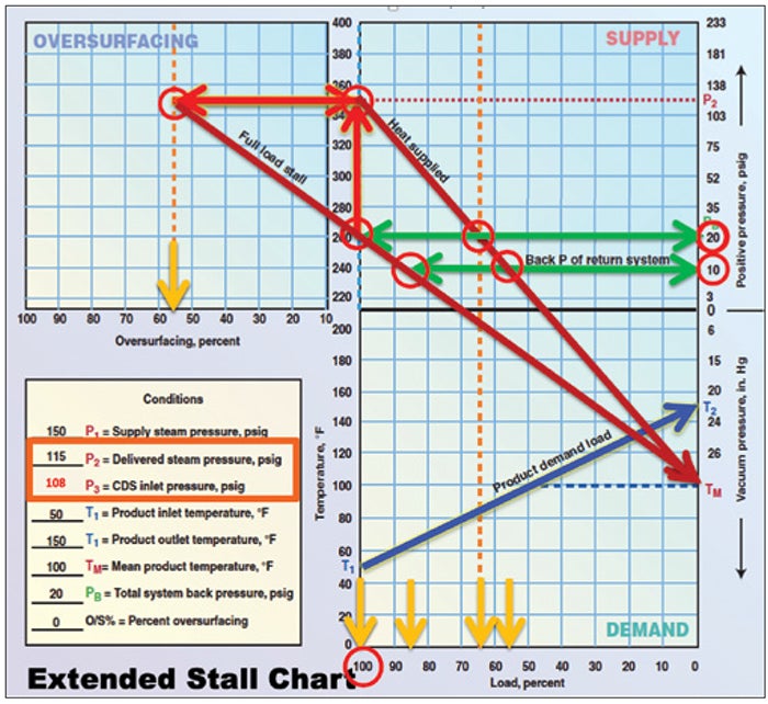 The extended stall chart (ESC) estimates steam supply pressure for different load conditions and heat-exchange surface area ( A) (from Q = U . A . Δ T) (Figure 3). Effectively, UA “reduces” as the tube bundle becomes fouled, and the steam pressure rises to adjust supply heat to the process. The horizontal green line in Figure 3 represents equipment back pressure, and the four red circles where the burgundy line intersects the green line represent various individual stall points [1, 3].