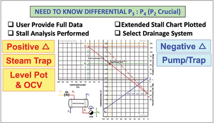 Essentially, if the process load always maintains positive pressure differential, P3 > P4, that is, pressure is always above the back pressure line for all load conditions, then only a simple device, such as a steam trap, is needed to help drain condensate from the steam space. Alternatively, a more complex drum and outlet control valve (OCV) arrangement can be used. However, if the pressure differential is sometimes negative, P3 < P4, then another type of drainage equipment is needed, such as a combination pump/trap system. Once appropriate data are entered into the ESC calculator [4], the anticipated stall point is identified and a recommended drainage device can be determined (Figure 4).