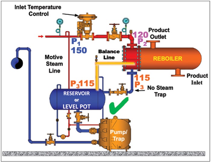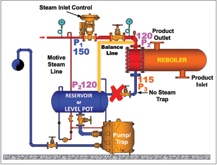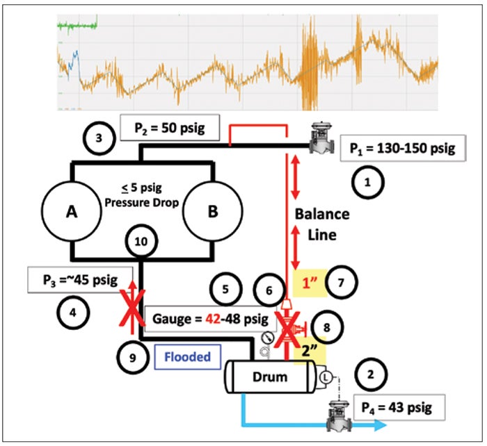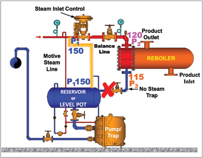 An improper balance-line connection can also create a negative pressure-differential situation, but it differs in that the balanced/localized steam pressure at the condensate vessel/drum that connects to the reboiler outlet is higher than the reboiler’s outlet pressure (P3). This is explained later in the article.