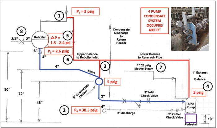 The question becomes, “Why was there difficulty when the SPD motive pressure of 52 psig was 13.5 psig higher than the back pressure (38.5 psig)?” Figure 10 explains the simple hydraulic issue that prevented this system from operating properly. The P3 outlet pressure is 2.6 psig and the 6-in. condensate header acting as a reservoir had P2 balance pressure of 5 psig. Condensate pushed by 2.6 psig cannot discharge into 5 psig unless the reboiler is 6 ft higher than the reservoir, but in this case, it was only 3.2 ft higher. This created a negative pressure differential, and hydraulically, the system could not drain as required.