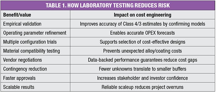 Every capital project carries uncertainty, whether it be due to feedstock behavior, separations performance, fouling and foaming potential, scaleup risks, energy consumption or general operability. An opportunity for project de-risking is the utilization of testing centers, pilot plants or laboratories where processes can be validated under realistic conditions. Such test centers can often support multi-million-dollar projects for chemical manufacturers, helping secure contracts by providing empirical proof of feasibility. Table 1 summarizes some of the de-risking benefits of tying physical project validation with cost estimation.
