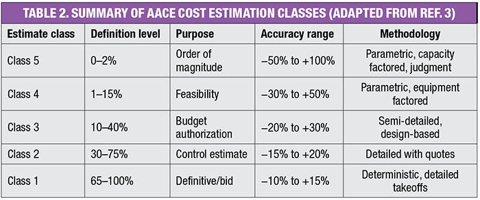 Cost estimates are classified by the level of project definition and associated accuracy ranges. The AACE’s five estimate classes commonly used across the chemical, process, and heavy industrial sectors, as described in Table 2.