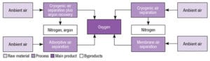 Oxygen can be commercially separated from atmospheric air, via cryogenic distillation and adsorptive separation (vacuum-swing adsorption processes) (Figure 2).