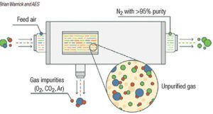 Membrane separation uses hollow-fiber membranes to separate nitrogen from oxygen (Figure 1). Membrane technology is commonly used when purity requirements are not stringent. Within the membrane system, many thousands of hollow fibers are placed in a housing and compressed air is supplied to one end. The fiber wall is permeable to gases, but the diffusion rate across the fiber wall varies according to the type of gas. For air, oxygen, carbon dioxide, argon and other trace contaminants pass through the wall at a faster rate than nitrogen, and are vented. Nitrogen exits the membrane system at a typical purity of greater than 95%. Users can adjust the flow through the system to vary the purity achieved by a membrane-based system. The advantage of a membrane-based system is there are no moving parts, but outlet purity may vary with flowrate.