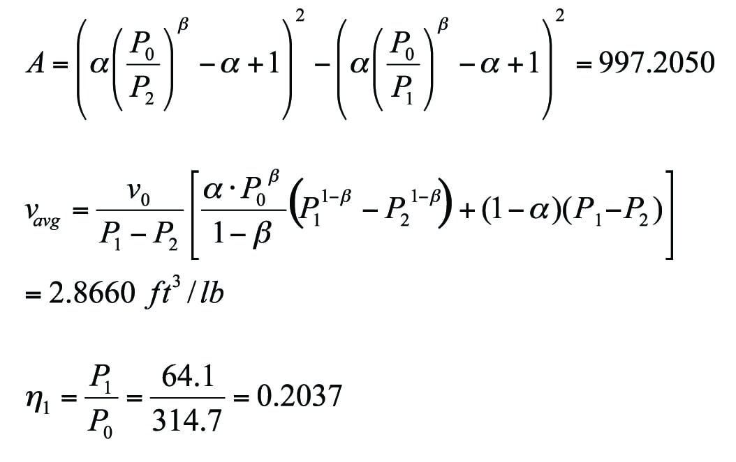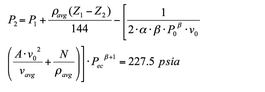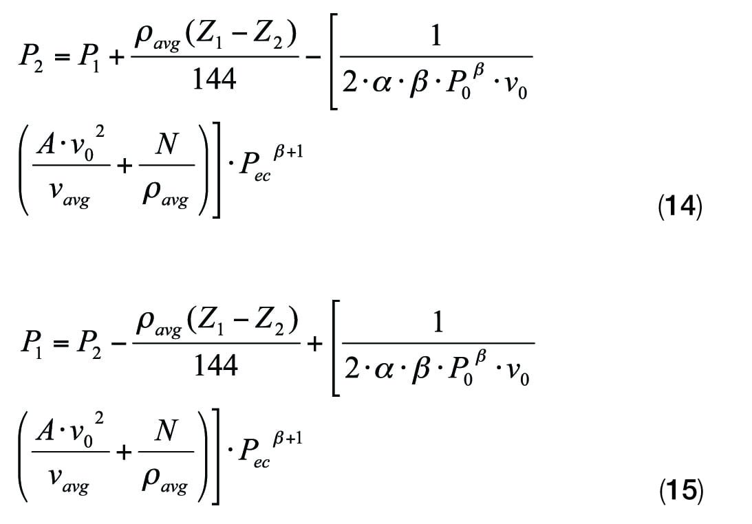 Two important values in Equation (9), average density and average specific volume, can be obtained by taking an arithmetic mean value of the densities or specific volumes over about 15 segments that are based on a constant pressure interval. However, the average specific volume and the average density can also be estimated using Equations (12) and (13), respectively. Equation (12) results in the best average specific volume. Equation (13) was derived from Equation (7) and is used to calculate accurate average density. One should be aware that Equation (13) requires an omega value or alpha value if beta is almost 1.0 (alpha = omega). The omega value should be based on the data at P0 and 50% of P0. Although Equation (13) provides very accurate results if the pressure-density correlation with omega fits well, the arithmetic mean density using Equation (11) is generally more reliable. The accuracy of the pipe flow equation is closely related to the accuracy of the specific volume prediction in a piping system. Thus, it is essential for the pipe-flow equation to have a good correlation of pressure and specific volume.