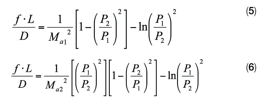 Equation (5) is an isothermal vapor-flow equation based on the inlet Mach number. On the other hand, Equation (6) is based on the outlet Mach number. The sizing of relief discharge piping at a given outlet pressure is generally performed with Equation (6), calculating back through the piping system to verify actual backpressure at each pressure relief device. For non-ideal gases, an incremental or stepwise approach is usually required to account for the changes in compressibility factor. API recommends this isothermal vapor equation that results in slightly more conservative predictions for most cases [1].