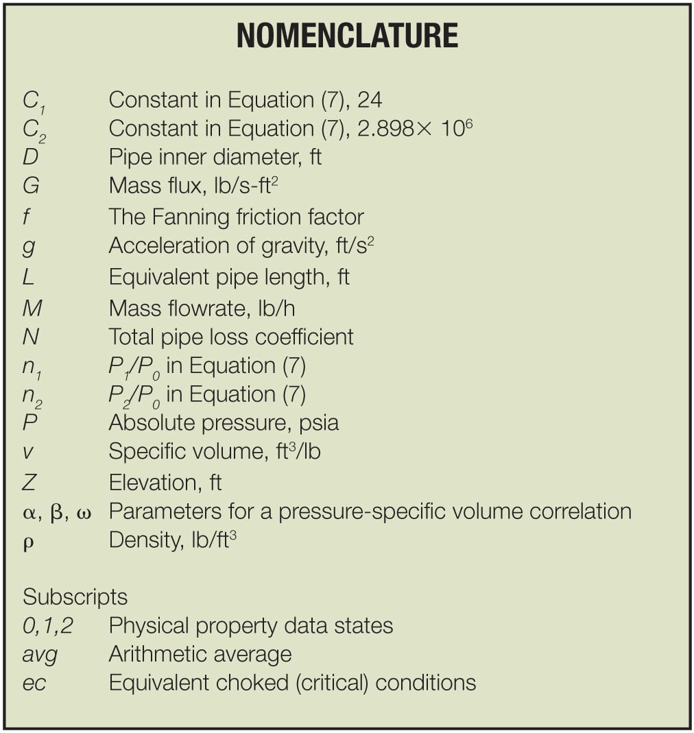 This article also examined the existing calculation procedures to develop a new procedure that is convenient and easy to follow as demonstrated in the example calculations. In those cases with significant velocity changes, it is possible that the universal equation based on isenthalpic flash may deviate from the actual flow path. It is well known that the actual pipe flow path is somewhere between isentropic and isenthalpic flow paths. Therefore, the authors are currently developing the calculation procedure for the actual flow path. In the meantime, the universal equation for pipe flows presented in this article can help design engineers complete their assigned tasks with a better understanding of the key parameters in pipe-flow equations, and even manipulate the equation for achieving successful and superior results.