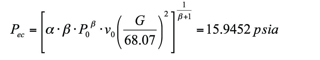 Second, calculate the Pec. The higher Pec than the vessel operation pressure of 14.7 psia means that the flow is choked at 15.9452 psia. So, the pipe inlet pressure should be calculated with the pipe outlet pressure of 15.9452 psia.