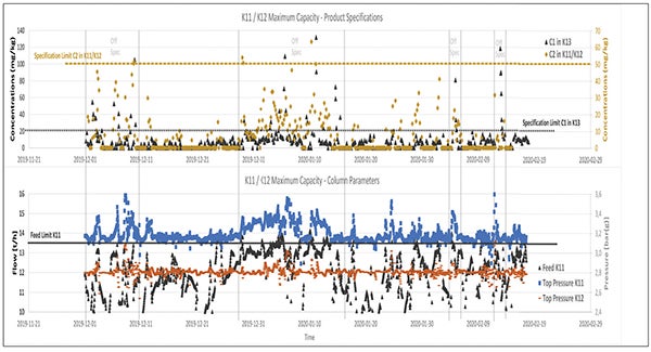 Whatever the cause, separation efficiency of the column K11/K12 decreased after the turnaround. Temperature surveys and field tests were conducted. The column data were matched to the data prior to the turnaround. The feed flow, overhead pressure and concentration profiles of columns before and after the turnaround are plotted in Figures 2 and 3. The specification limits of C2 of the product column K11/K12 and C1 of the downstream column K13 are indicated, along with the intervals of the off-specification product C2 and C1, corresponding to feed flow rates in 2019 and 2020.
